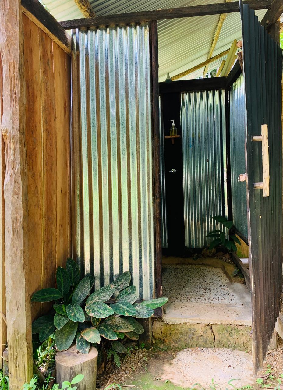 The bathroom is shared with the other cabin and has: